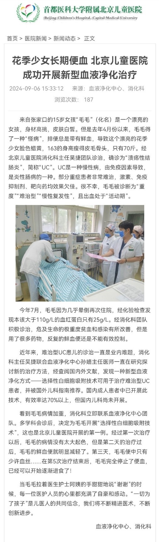 企業(yè)資訊 選擇性白細胞吸附技術(shù)在兒科難治型UC患者上的成功應(yīng)用 (2024/9/18)